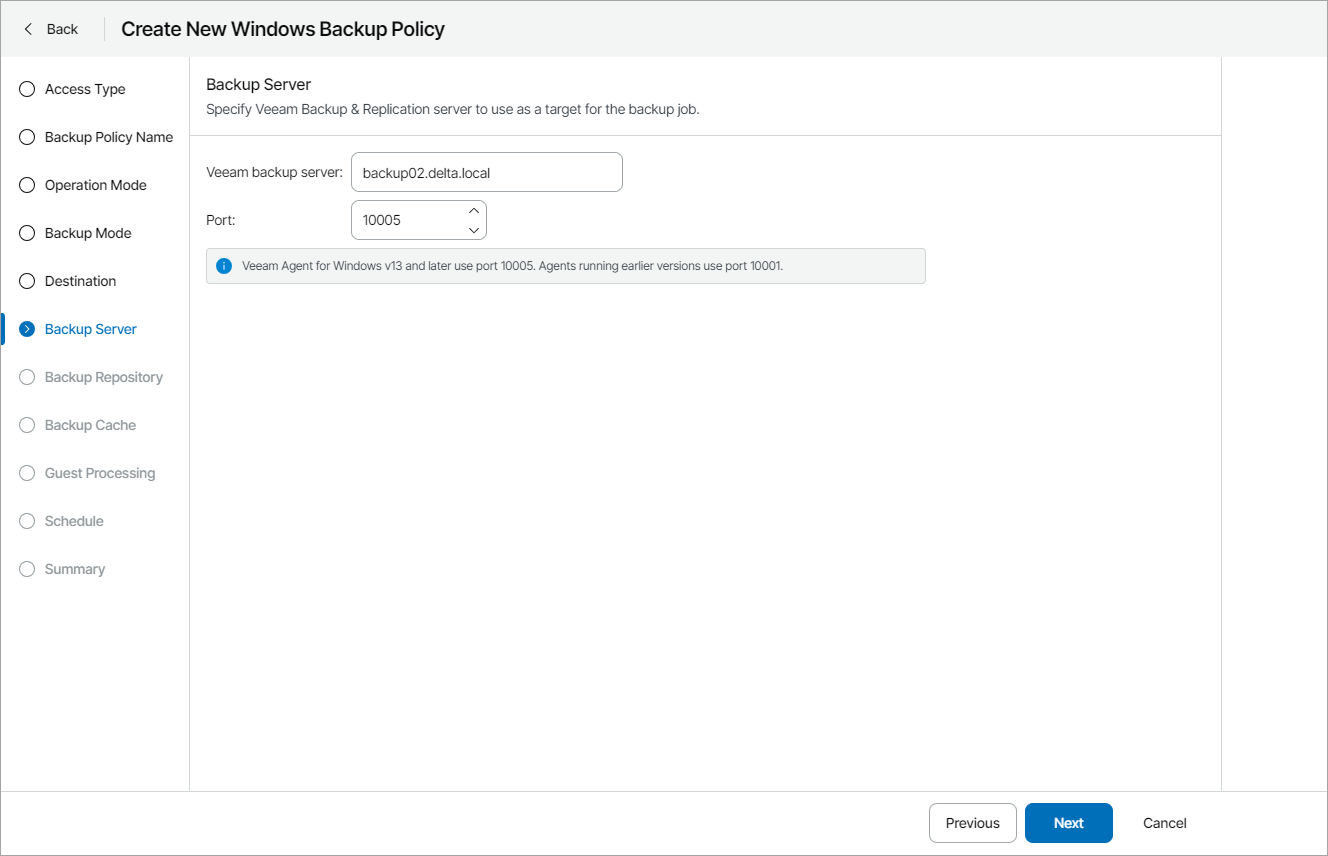 By default, Veeam Agent for Microsoft Windows version 13 or later uses port 10005. Earlier Veeam Agent for Microsoft Windows versions use port 10001.