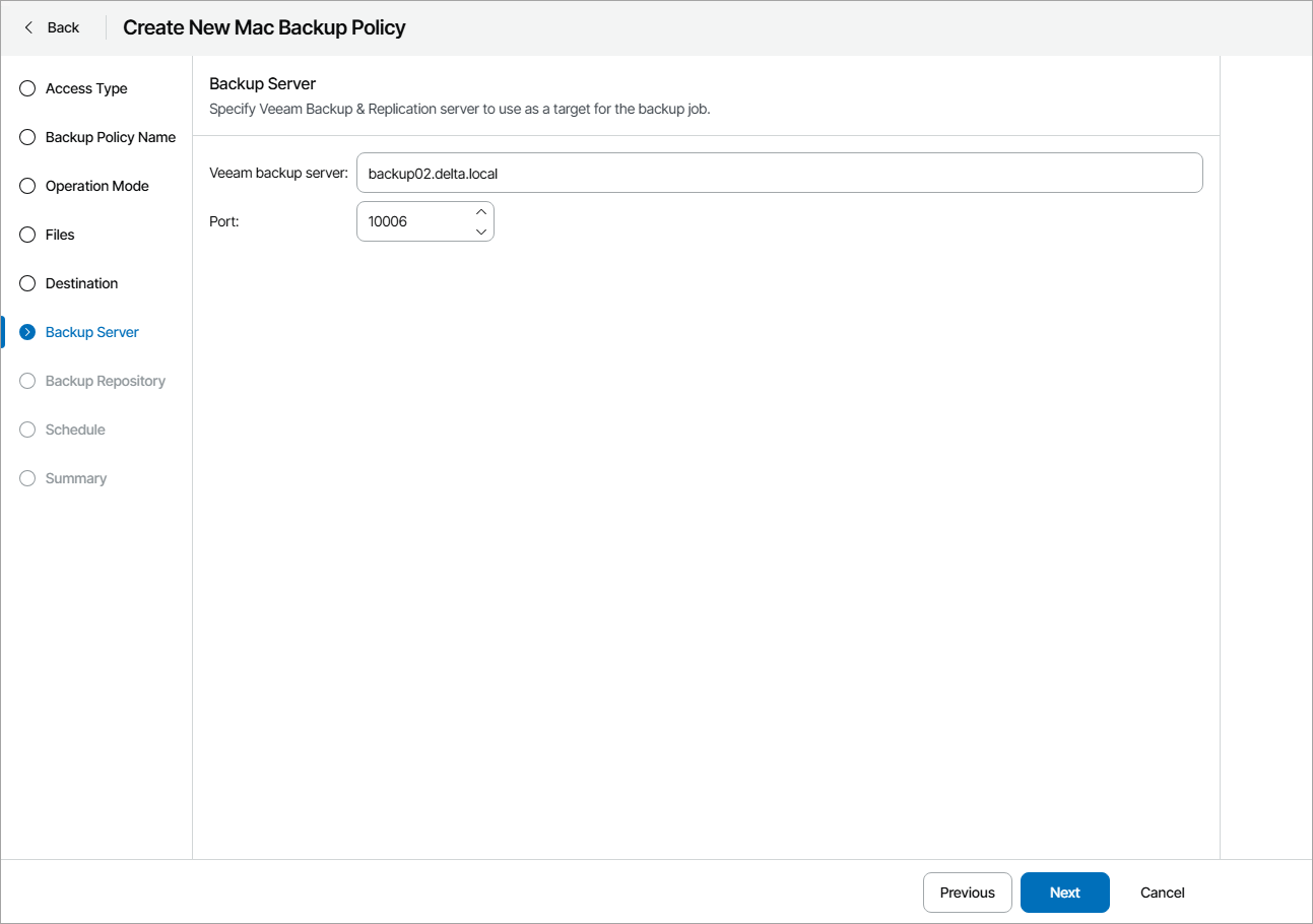 The Backup Server step of the wizard is available if at the Destination step you have chosen to store backup files on a Veeam backup repository.