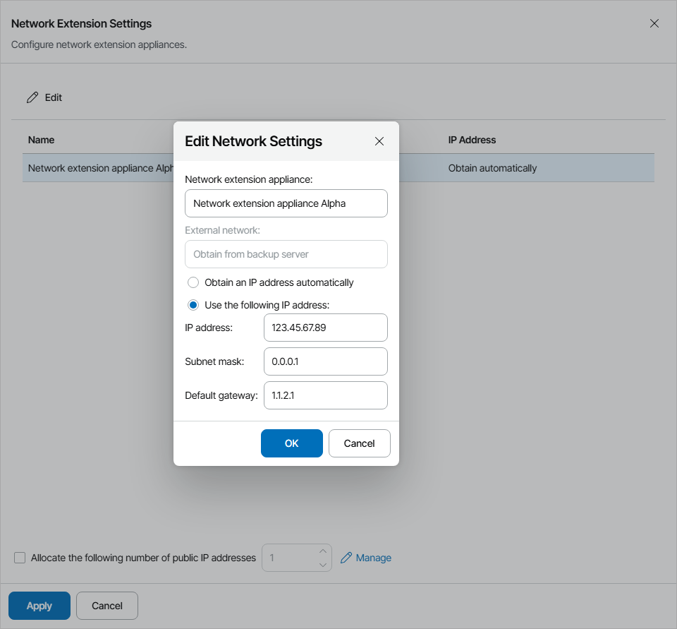 You can configure a network adapter (vNIC) on the network extension appliance. This network adapter connects the network extension appliance to the external network where the provider backup infrastructure components reside. For details, see section Network Extension Appliance of the Veeam Cloud Connect Guide.
