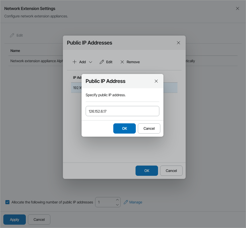 - [Optional] If you have not reserved in advance the necessary number of public IP addresses that can be assigned to VM replicas, click Manage at the bottom of the window to add one or several IP addresses to the pool of available public IP addresses. For details, see Managing Public IP Addresses.