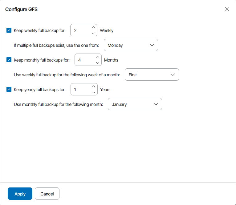 In the Configure GFS window, specify how long you want to keep weekly, monthly and yearly full backups.
