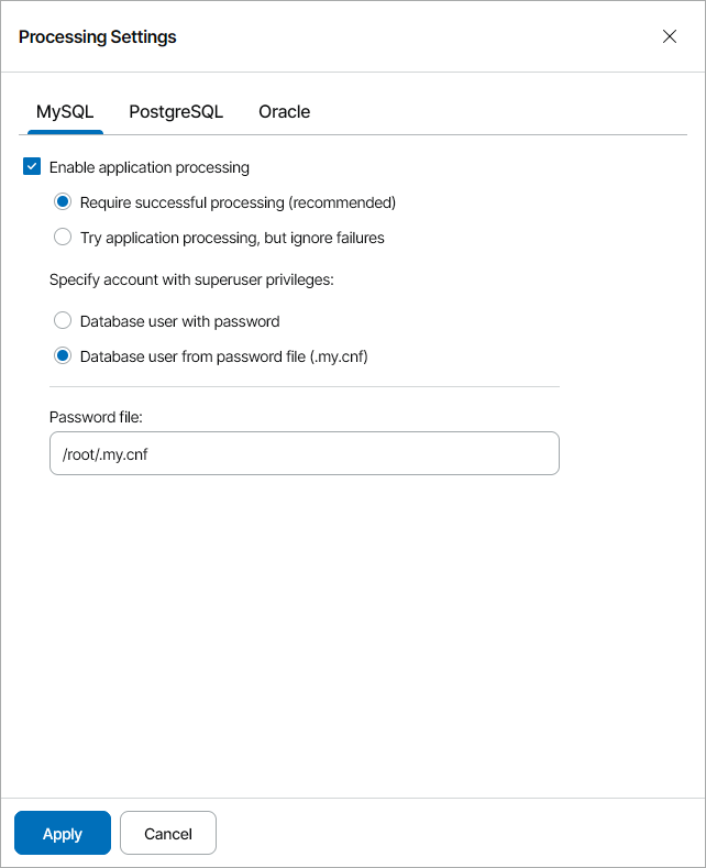 With this option selected, you must specify a path to the password file, but do not need to specify account credentials in the backup job settings. For details about password file configuration, see section Preparing Password File for MySQL Processing of the Veeam Agent for Linux User Guide.
