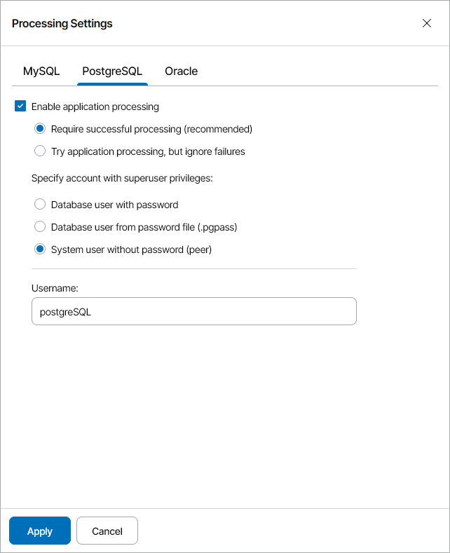 • Require successful processing. With this option selected, Veeam Agent for Linux will stop the backup process if an error occurs when processing the PostgreSQL database system.