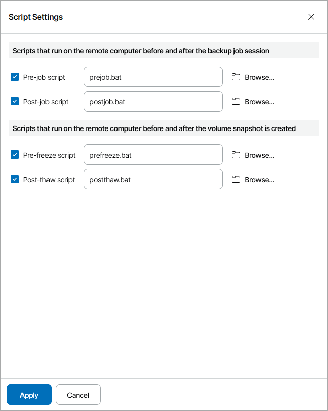 3. In the Script Settings window, specify custom scripts that you want to execute: