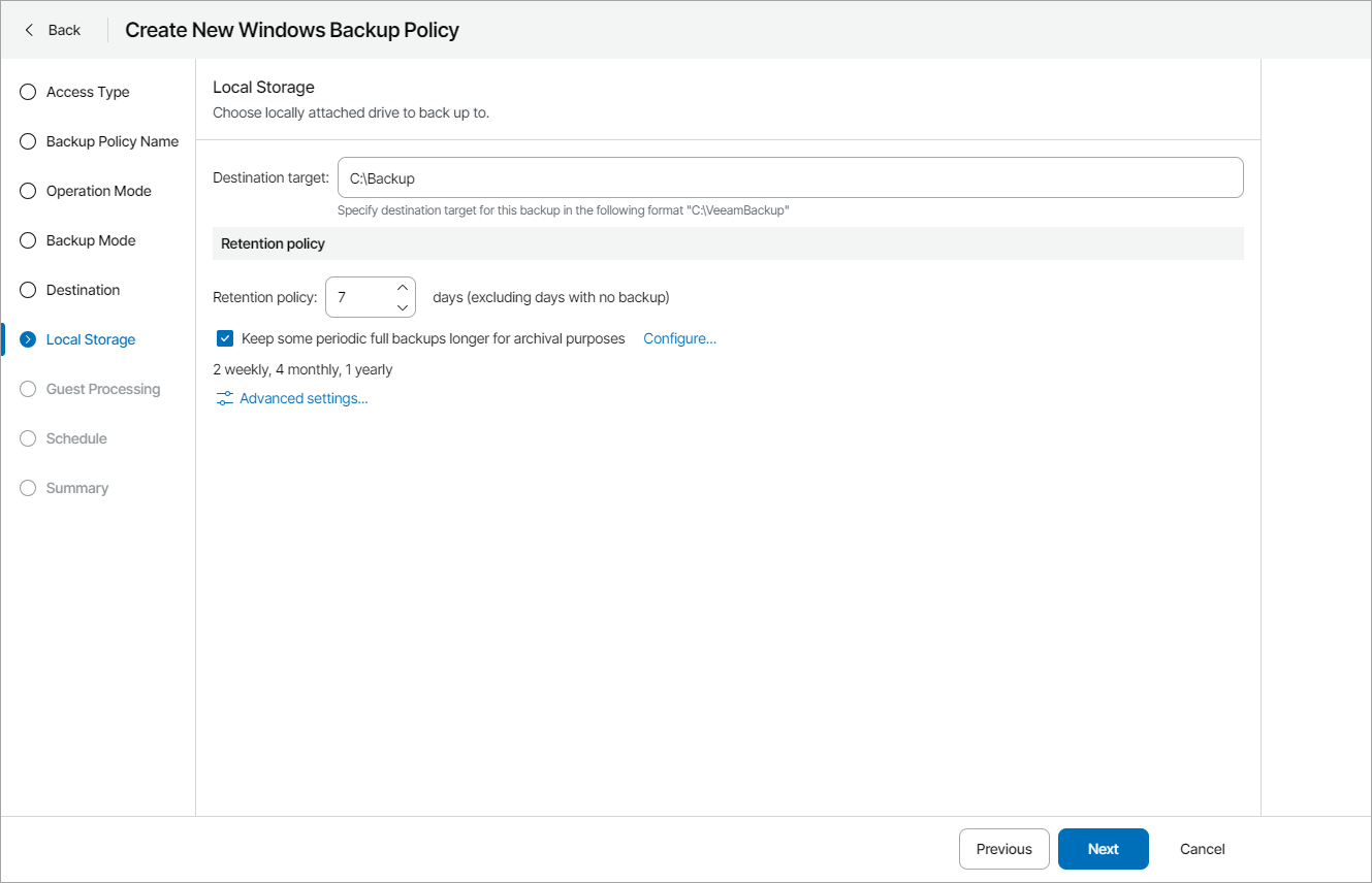 The Local Storage step of the wizard is available if at the Destination step you have chosen to save the backup on a local drive of the computer.