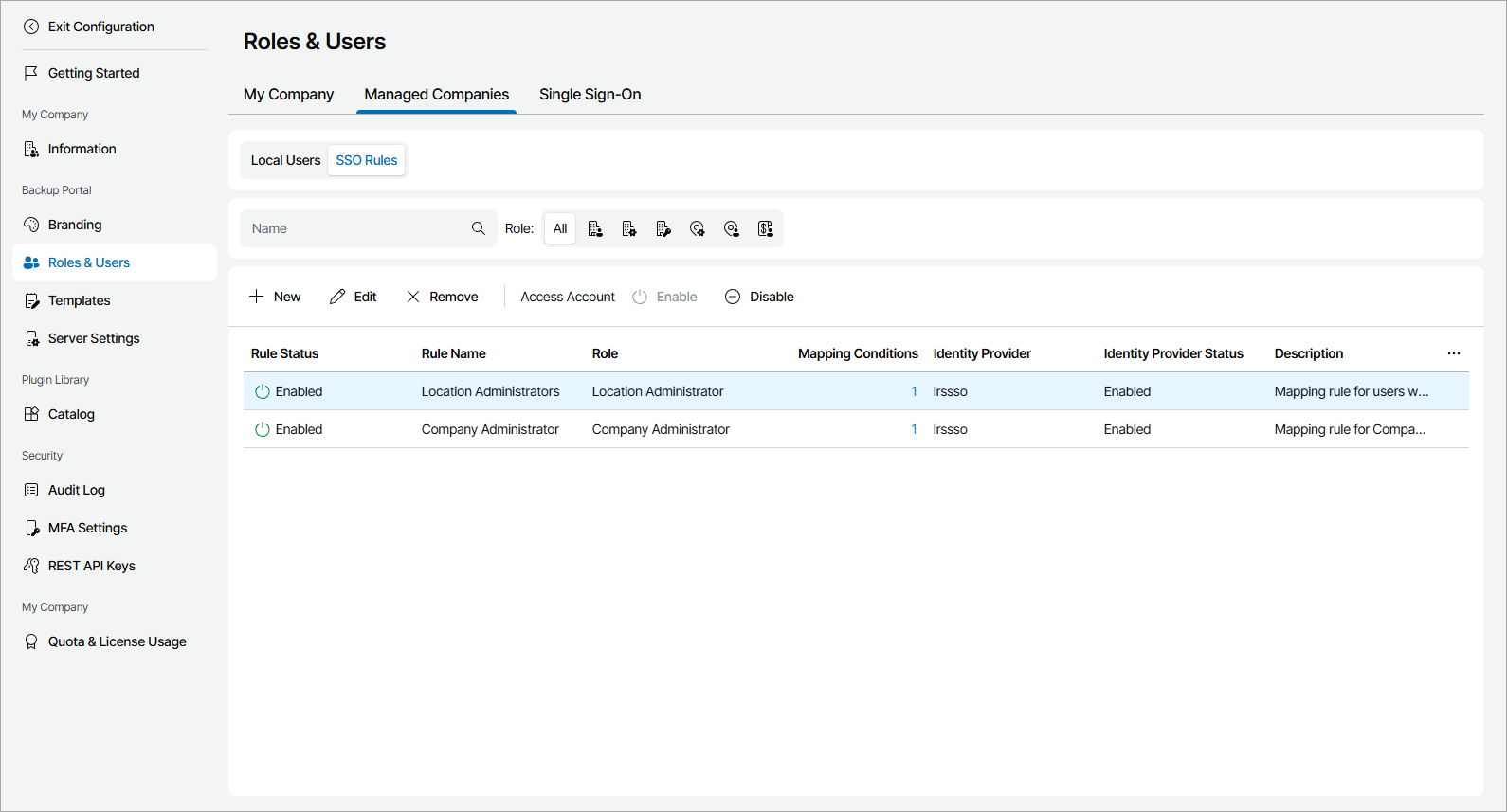- On the My Company or Managed Companies tab, navigate to SSO Rules.