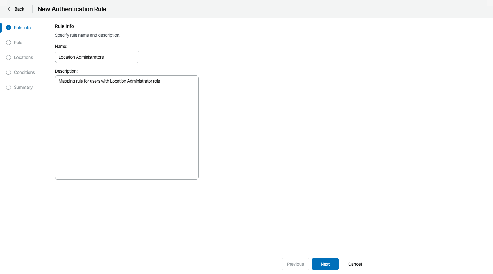 - At the Rule Info step of the wizard, specify a name and description for the user identity.