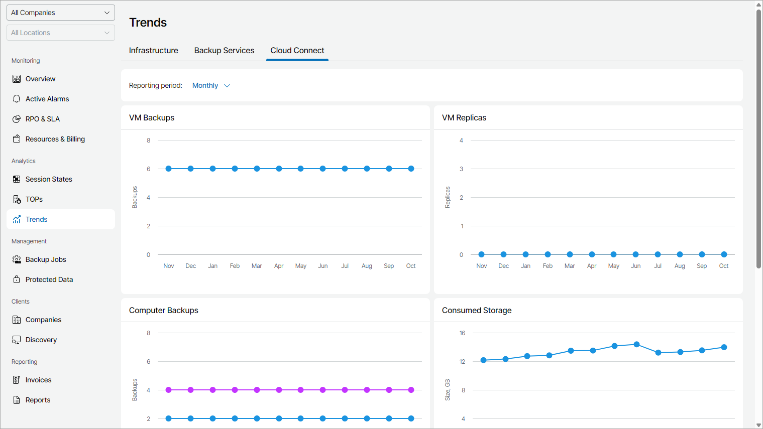 - VM Backups widget shows how the number of VMs backed up to cloud repositories has been changing during the reporting period.