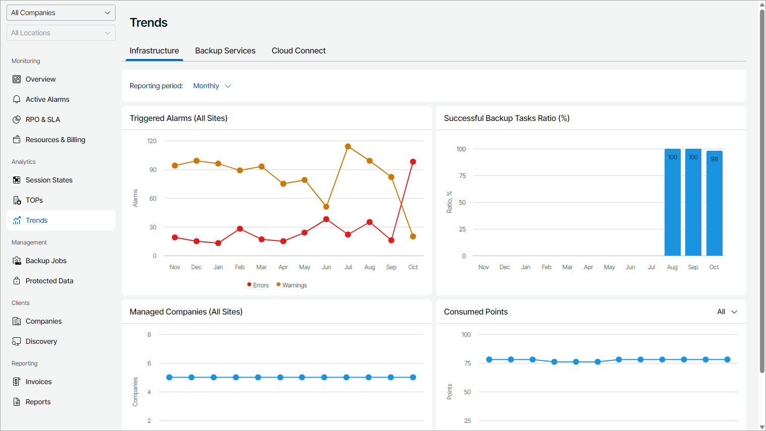 The Infrastructure view provides summary information on the number of triggered alarms, successful backup tasks ratio, the number of managed companies and the number of consumed points during the reporting period.