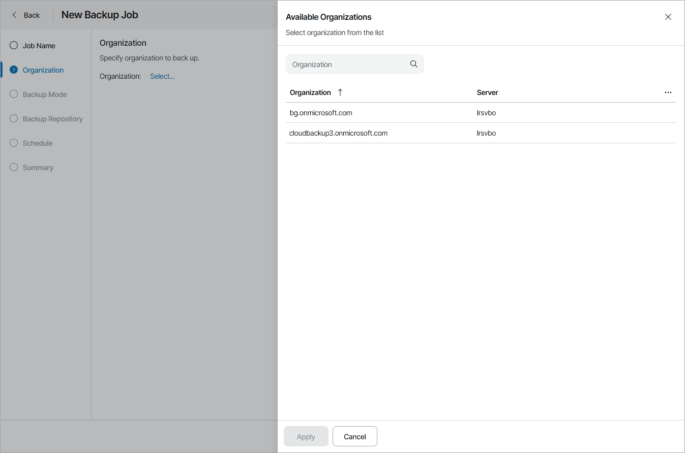 At the Organization step of the wizard, choose organization to back up:
