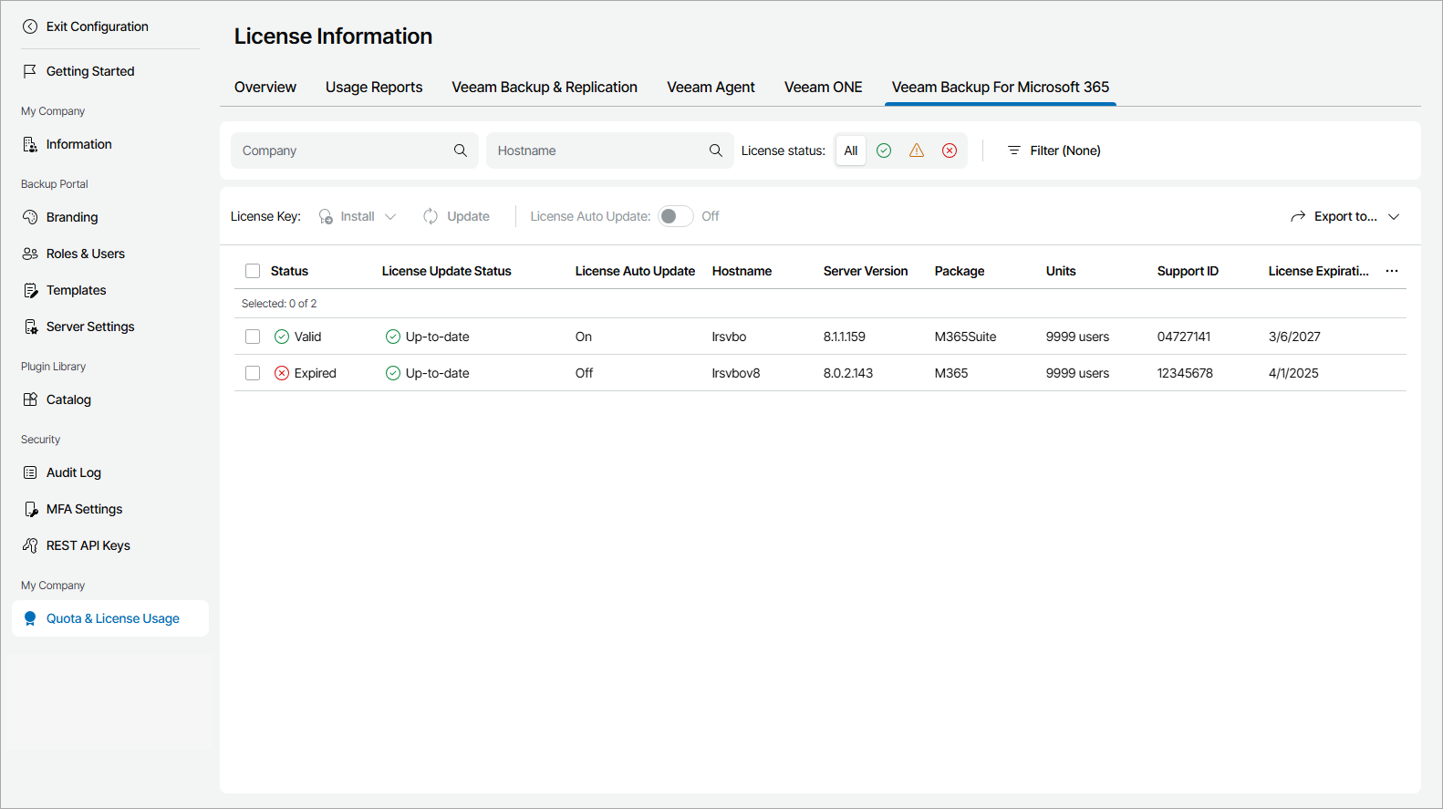 - Hostname — name of a Veeam Backup for Microsoft 365 server for which license details are provided.