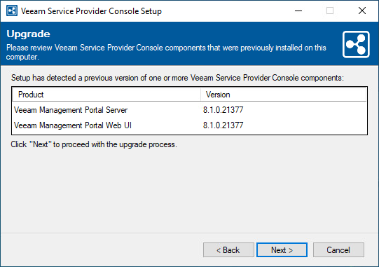 If you deployed Veeam Service Provider Console using a distributed installation scenario, you must first upgrade the Server component, and then the Web UI component.
