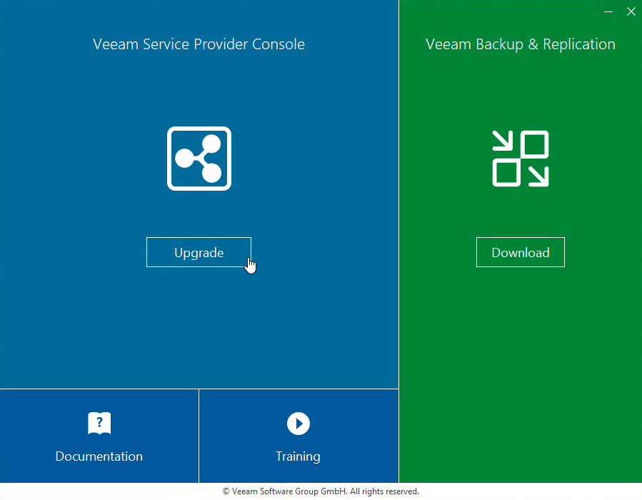 - On the splash screen, click the Upgrade tile to launch the Veeam Service Provider Console Setup wizard.