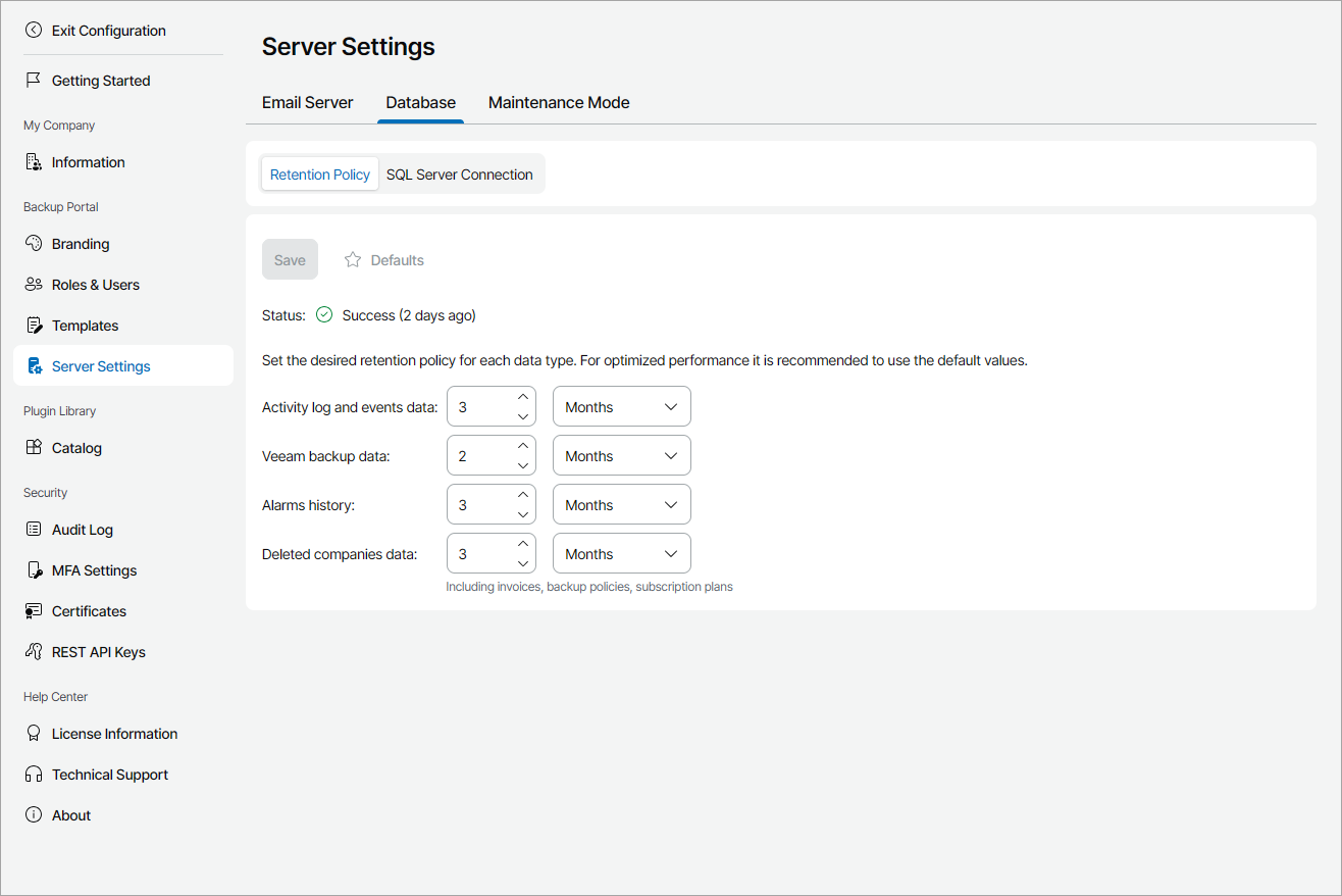 On the Retention Policy tab, you can check the status of the latest retention session and modify the period for which historical data must be stored in the Veeam Service Provider Console database.