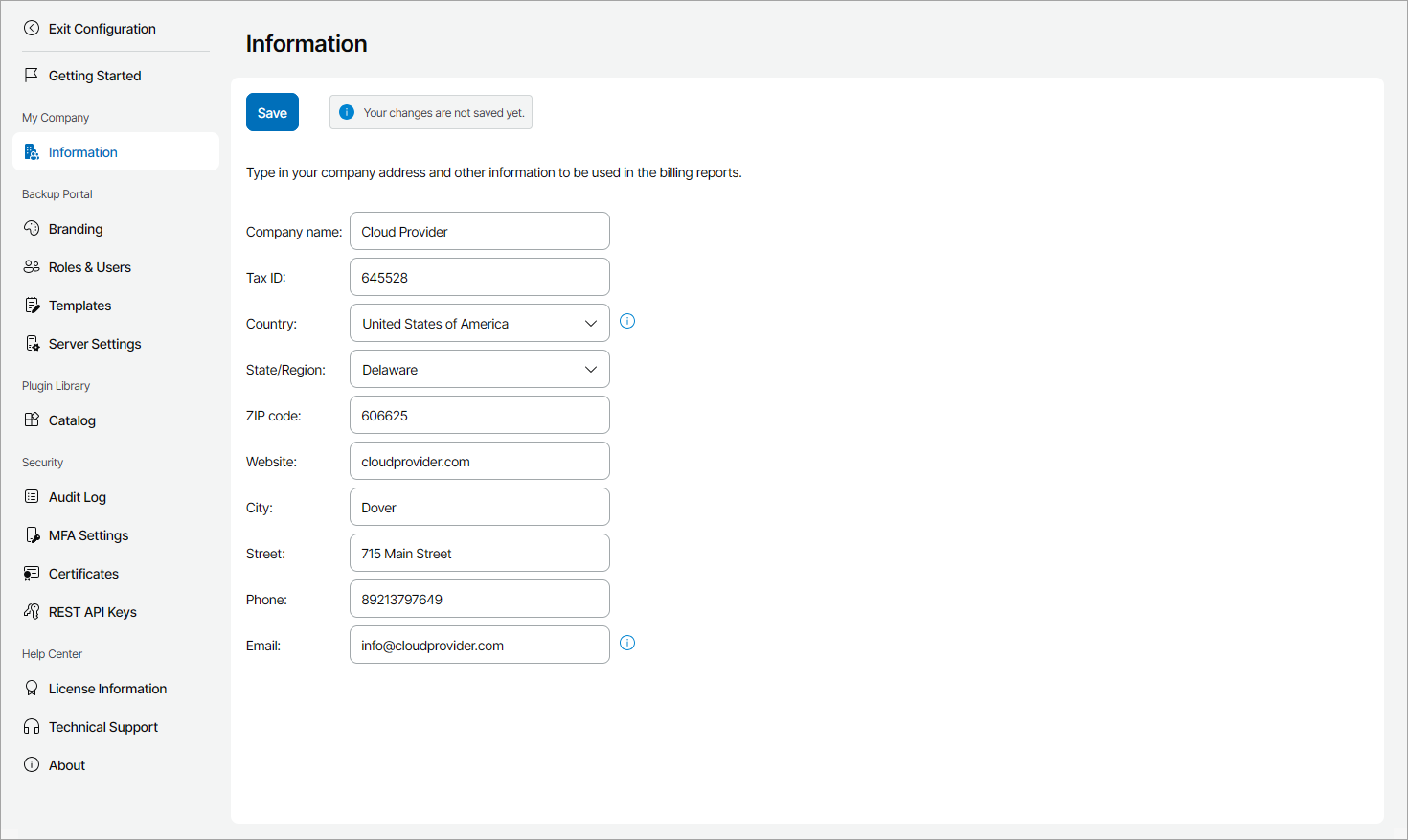 Before you start working with Veeam Service Provider Console, you must fill in the company profile. The profile contains information about the service provider company, such as the company name, address and so on. Company profile details are displayed in invoices, backup reports and email notifications.