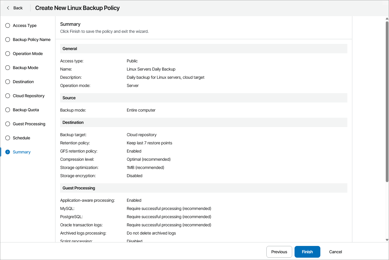 At the Summary step of the wizard, review settings of the configured backup policy and click Finish.