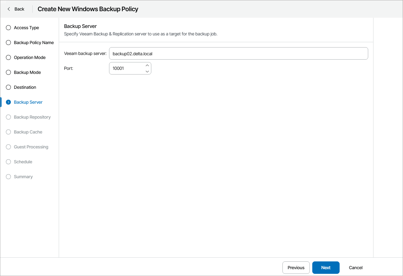The Backup Server step of the wizard is available if at the Destination step you have chosen to store backup files on a Veeam backup repository.