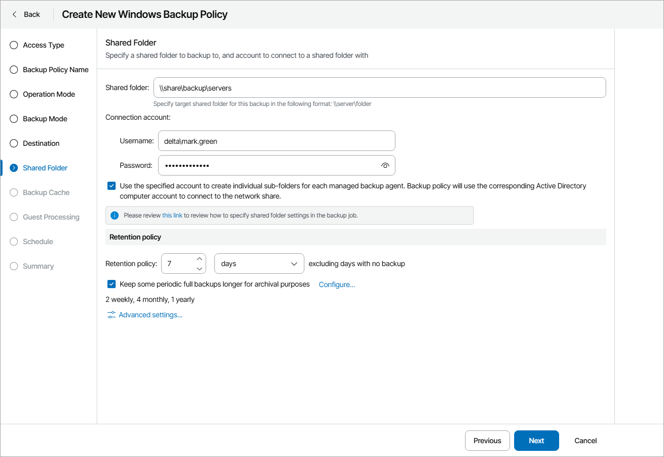 The Shared Folder step of the wizard is available if at the Destination step you have chosen to save the backup in a network shared folder.