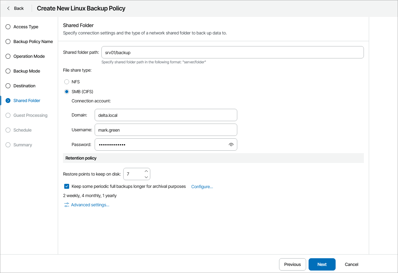 The Shared Folder step of the wizard is available if at the Destination step you have chosen to save the backup in a network shared folder.