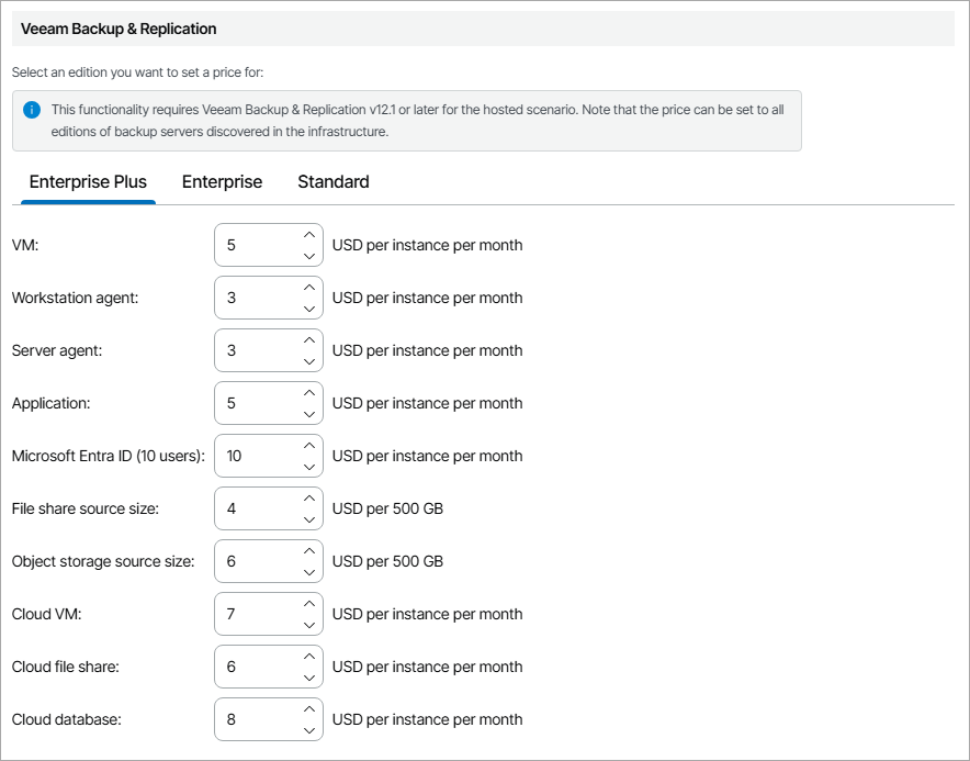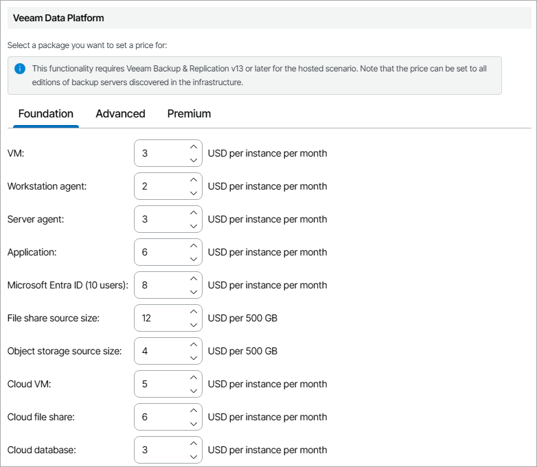 - In the Microsoft Entra ID (10 users) field, provide a charge rate for a license instance consumed by packs of 10 Microsoft Entra ID users protected by Veeam Backup & Replication with an installed Veeam Data Platform license.