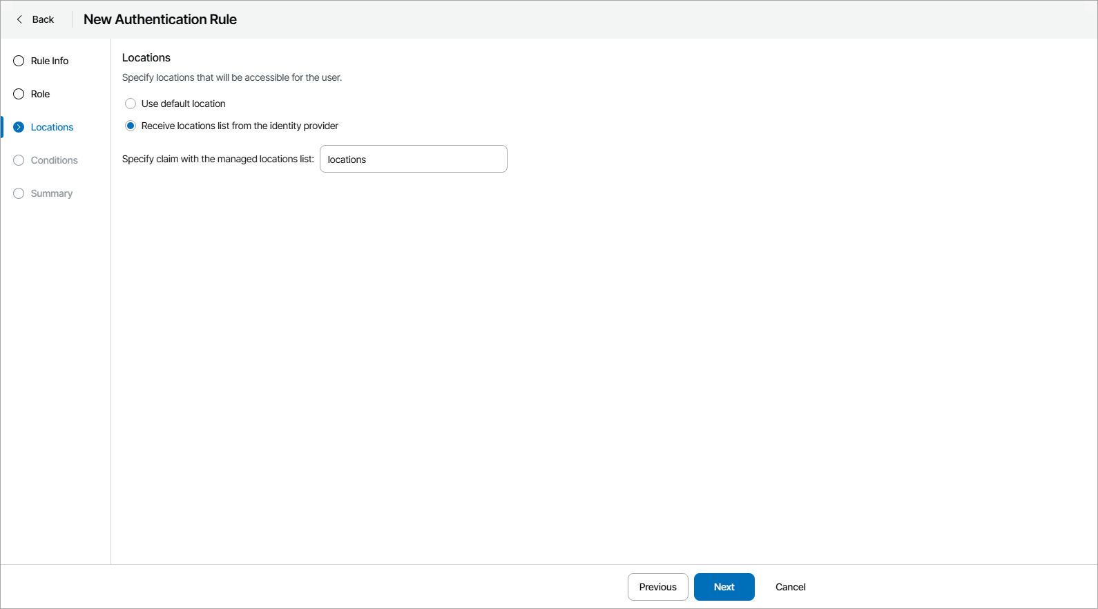 - [For the Location Administrator and Location User user roles] At the Locations step of the wizard, you can assign locations listed in the claim on the IdP side to a user identity. To do that: