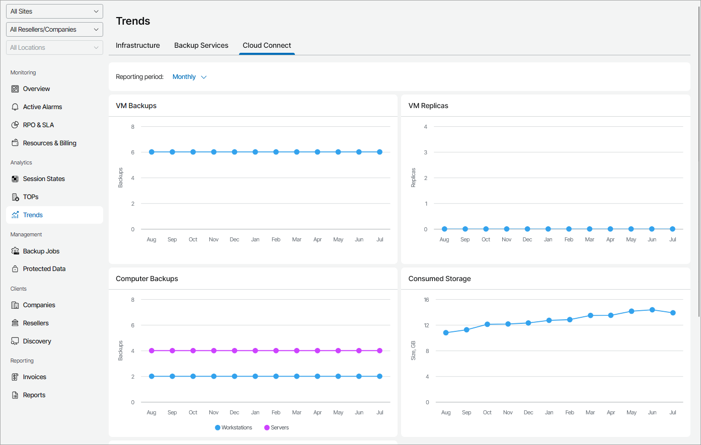 - VM Backups widget shows how the number of VMs backed up to cloud repositories has been changing during the reporting period.