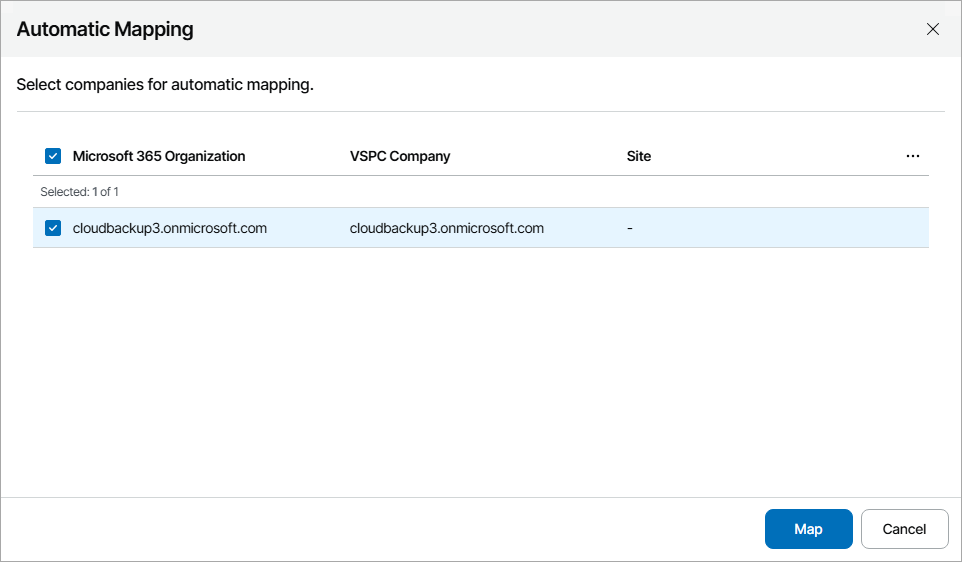 - From the list of companies and organizations, select one or more unmapped Veeam Backup for Microsoft 365 organizations.