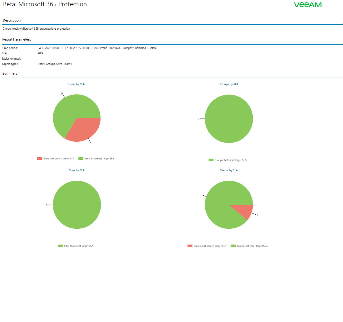 To monitor the efficiency of data protection implemented with Veeam Backup for Microsoft 365, you can create the Protected Microsoft 365 objects report. The report examines whether protected Microsoft 365 objects are compliant with the target defined in the SLA. For details, see section Protected Microsoft 365 Objects Backup Report in the Guide for Service Providers.