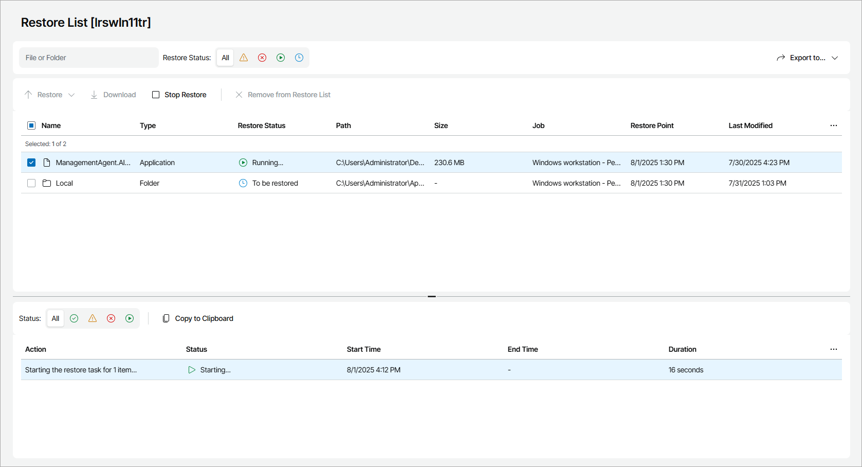 To export restore list details, click Export to and choose a format of the exported data: