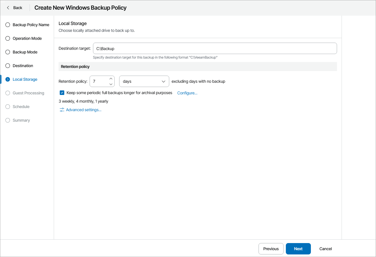 The Local Storage step of the wizard is available if at the Destination step you have chosen to save the backup on a local drive of the computer.