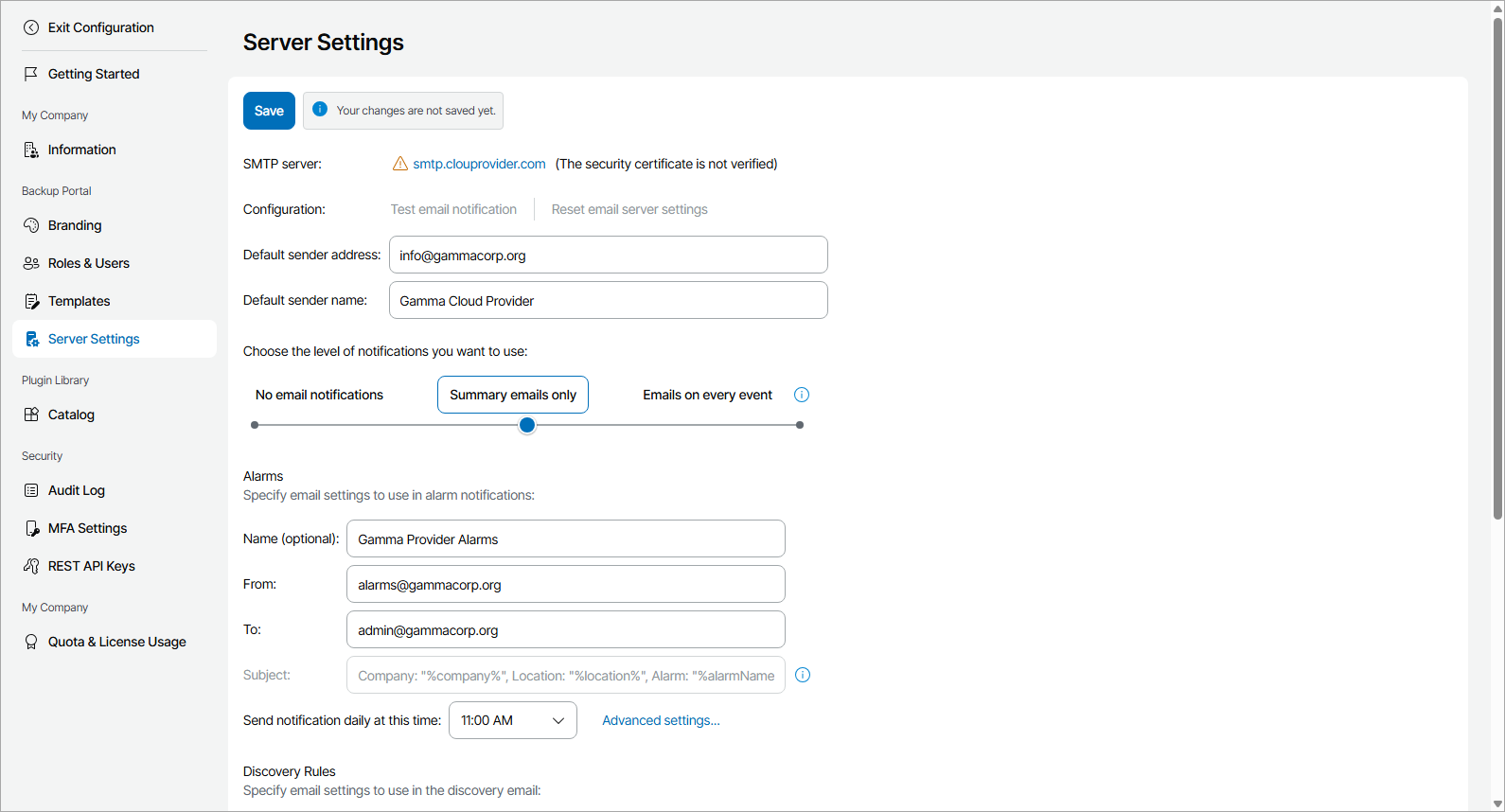 Veeam Service Provider Console will check the TLS certificate of the SMTP server. If the certificate is not trusted, Veeam Service Provider Console displays a warning.