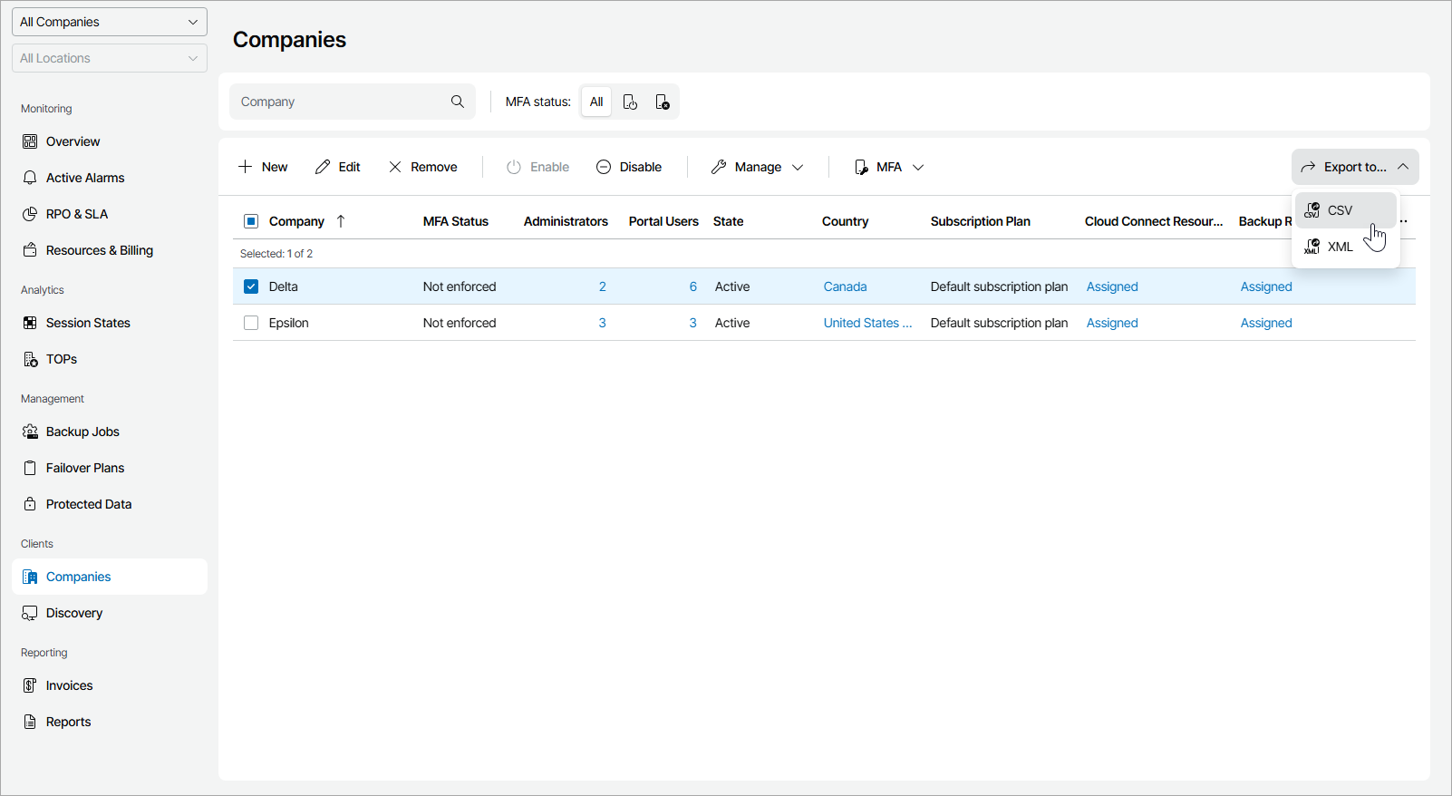 Veeam Service Provider Console will display a list of all registered company accounts.