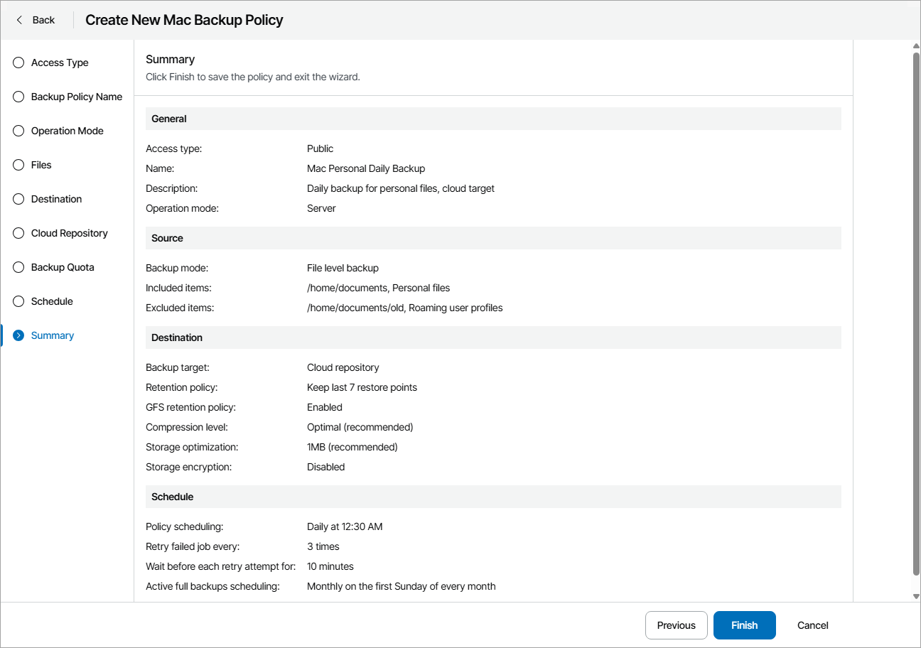 This is an archive version of the document. To get the most up-to-date information, see the current version. Step 15. Review Backup Job Settings At the Summary step of the wizard, review settings of the configured backup policy and click Finish.