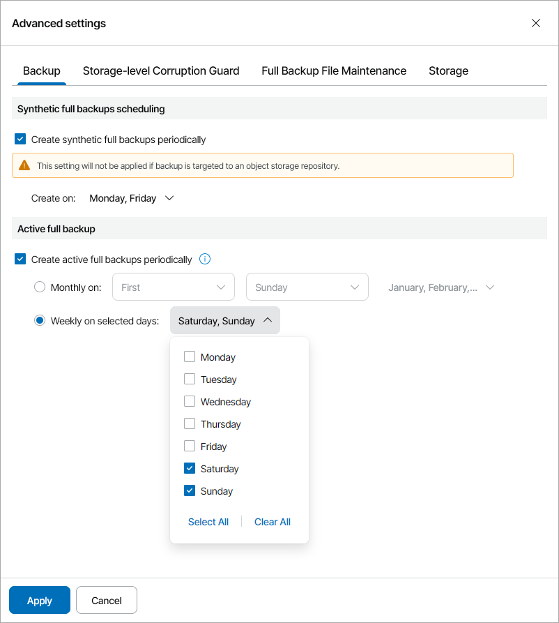 1. If you want to periodically create synthetic full backups, select the Create synthetic full backups periodically check box, and select the necessary week days on which to schedule synthetic full backups.