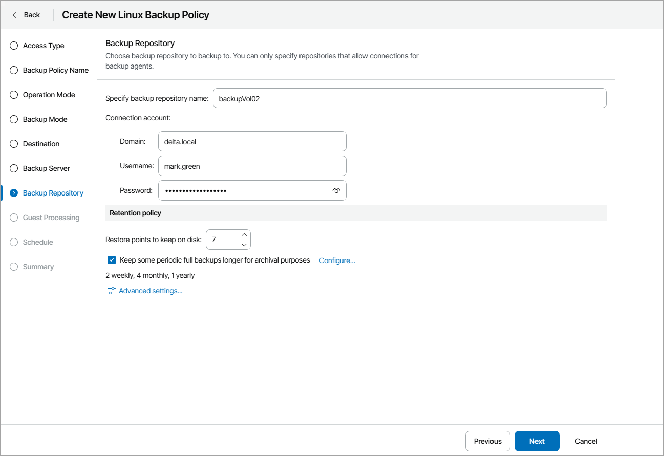 Permissions on the backup repository managed by the target Veeam backup server must be granted beforehand. For details, see section Setting Up User Permissions on Backup Repositories of the Veeam Agent for Linux User Guide.