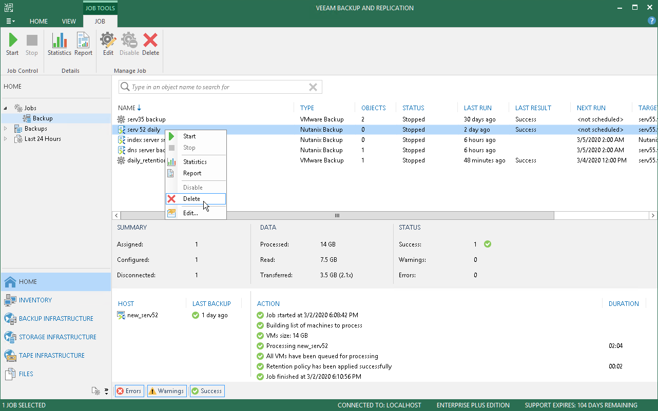 You can permanently delete a job from AHV Backup Proxy and from the configuration database. When you delete a job, backup files created by the job are not deleted. The backup files remain in the repository and will be tagged as "imported".