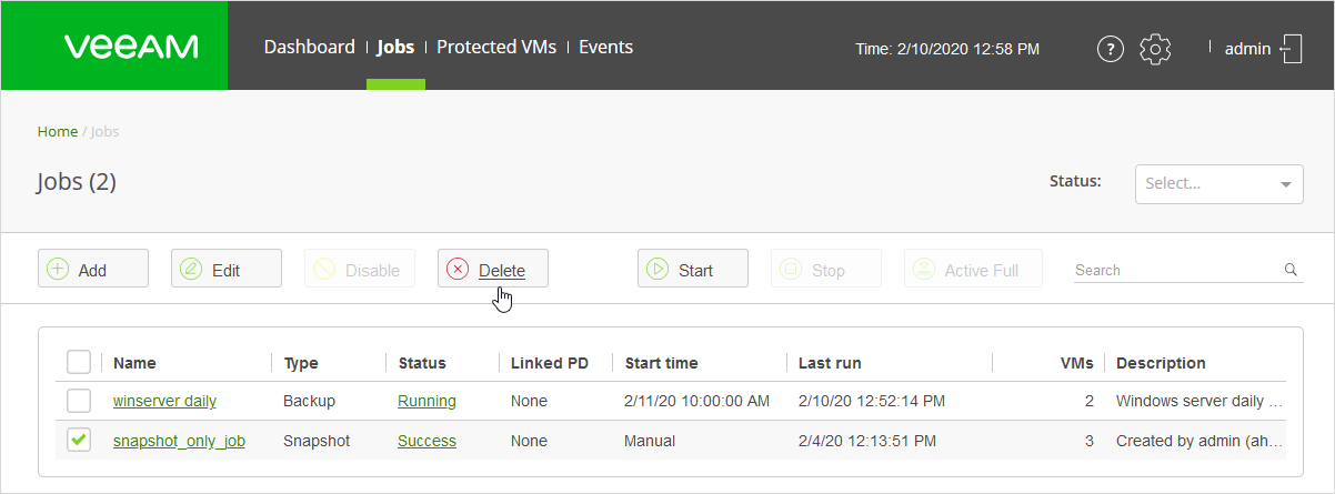 - In the list of jobs, select a job and click Delete on the toolbar.