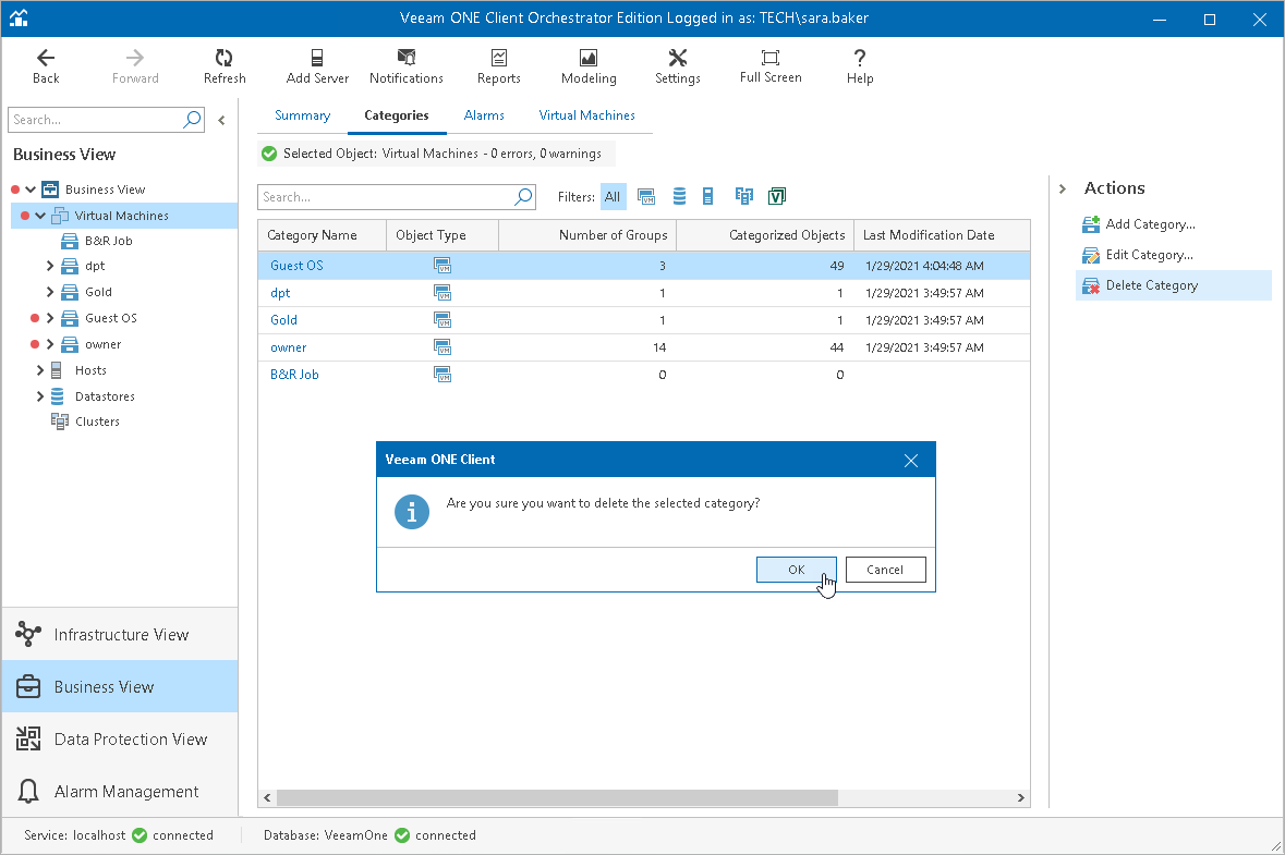 You can delete categories created in Veeam ONE Client as well as predefined categories and categories imported manually from a CSV file. When you delete a category, objects from this category remain in your infrastructure.