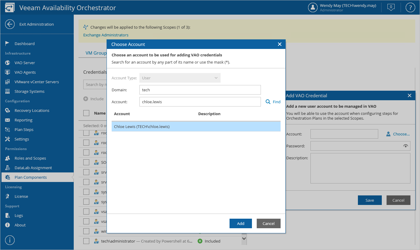 You can also add any credentials of your choice, even those that do not exist yet. To do that, in the Add VAO Credential window, use the Account and Password fields to enter an account name and a password for the account, and click Save. |