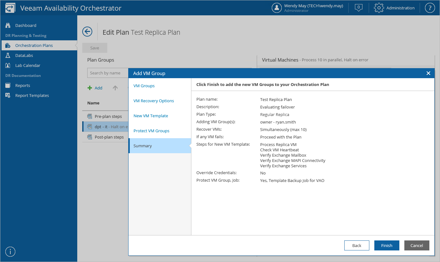 - To configure VM recovery options and to choose default steps that will be performed for all VMs in the group, follow the instructions provided in section Creating Regular Replica Plans (steps 5–6), Creating CDP Replica Plans (steps 5–6), Creating Restore Plans (steps 6–7) or Creating Storage Plans (steps 5–6).