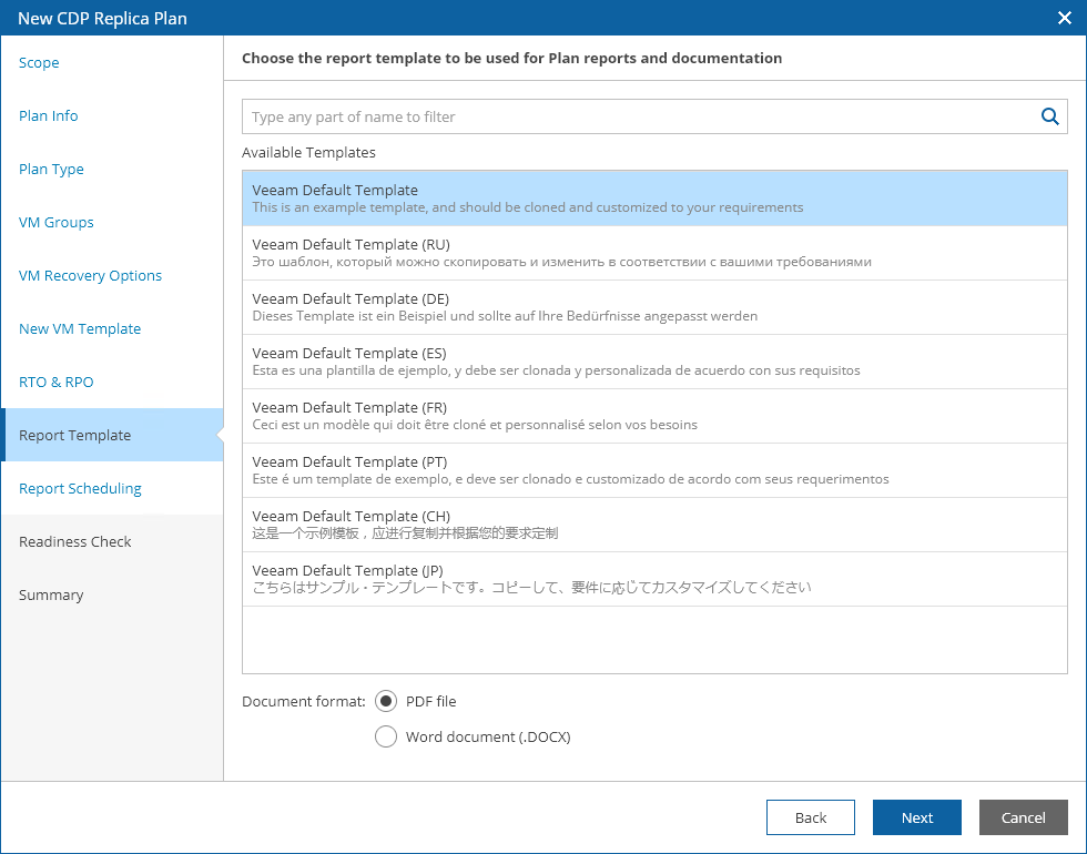 At the Report Template step of the wizard, select a document template that will be used to create documents for the plan. Use options in the Document format list to choose whether you want to generate documents in the DOCX or PDF format.