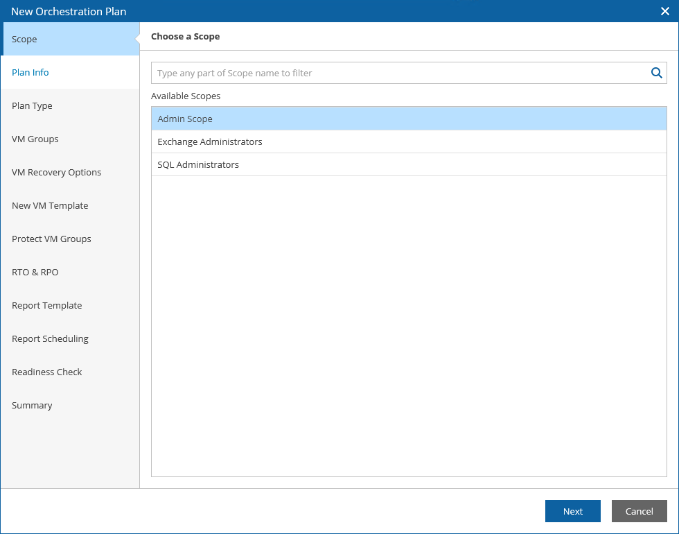 At the Scope step of the wizard, select a scope for which you want to create the plan.
