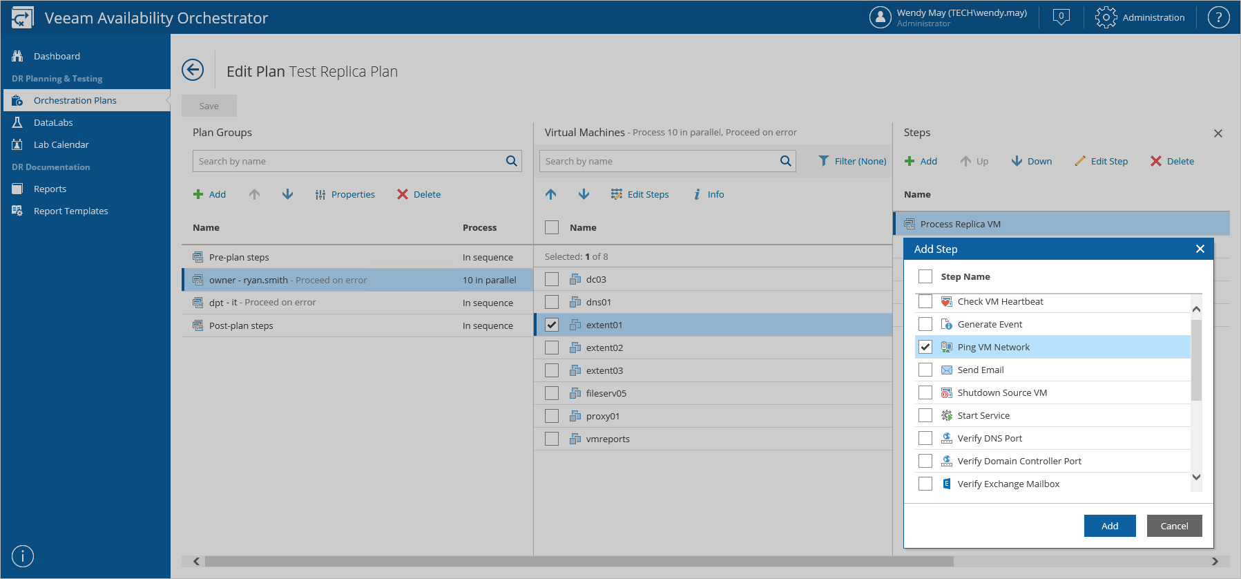 You can simultaneously add steps for multiple VMs in each VM group. To do that, select a VM group in the Plan Groups column, select the necessary VMs in the Virtual Machines column and then click Edit Steps. In the Edit Steps window, click Add in the Steps column, select the required steps that you want to add and then click Add. After you click Apply, the changes will be applied to all the selected VMs in the group. |