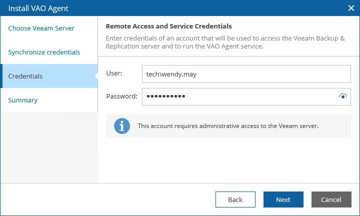 - At the Credentials step, in the User and Password fields, specify credentials of a user account for connecting to the server. The provided credentials will be also used to launch the VAO agent on the server.