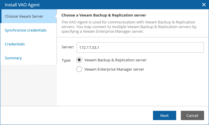 - At the Choose Veeam Server step, in the Server field, enter a DNS name or an IP address of the server where you want to deploy the VAO agent.