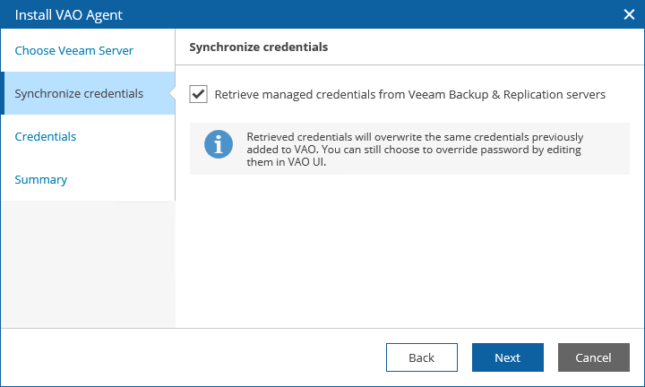 - At the Synchronize Credentials step, choose whether you want to retrieve credentials from the connected Veeam Backup & Replication server. You will be able to use these credentials later when configuring orchestration plan steps.