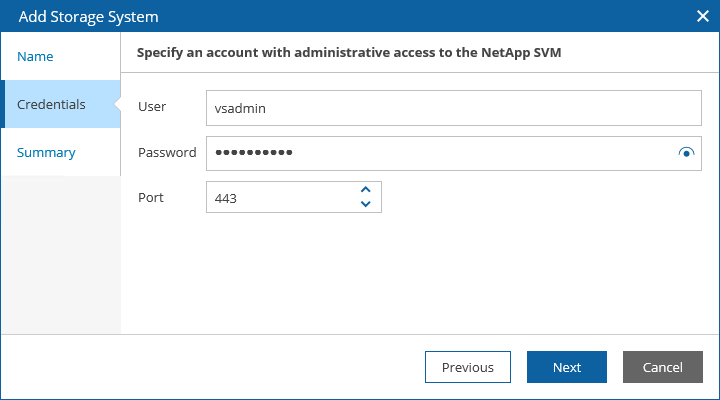 - At the Credentials step, in the User and Password fields, specify credentials of a user account for connecting to the storage system. For more information on the required account permissions, see Permissions.
