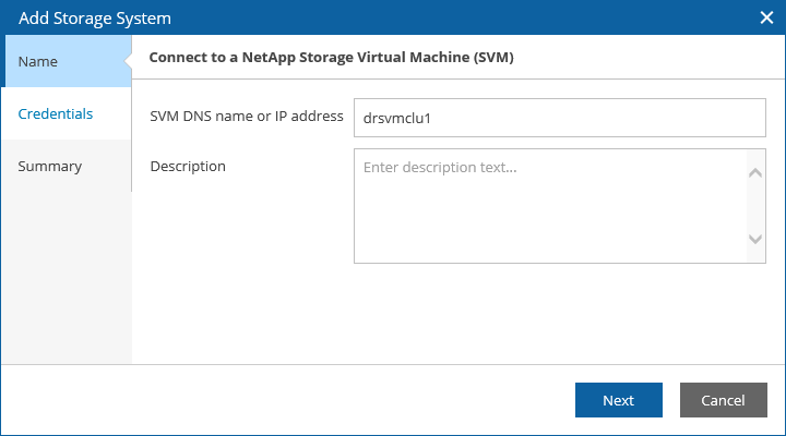 - At the Name step, use the Name and Description fields to enter a DNS name or an IP address of the storage system that will be connected to the VAO server, and to provide a description for future reference.