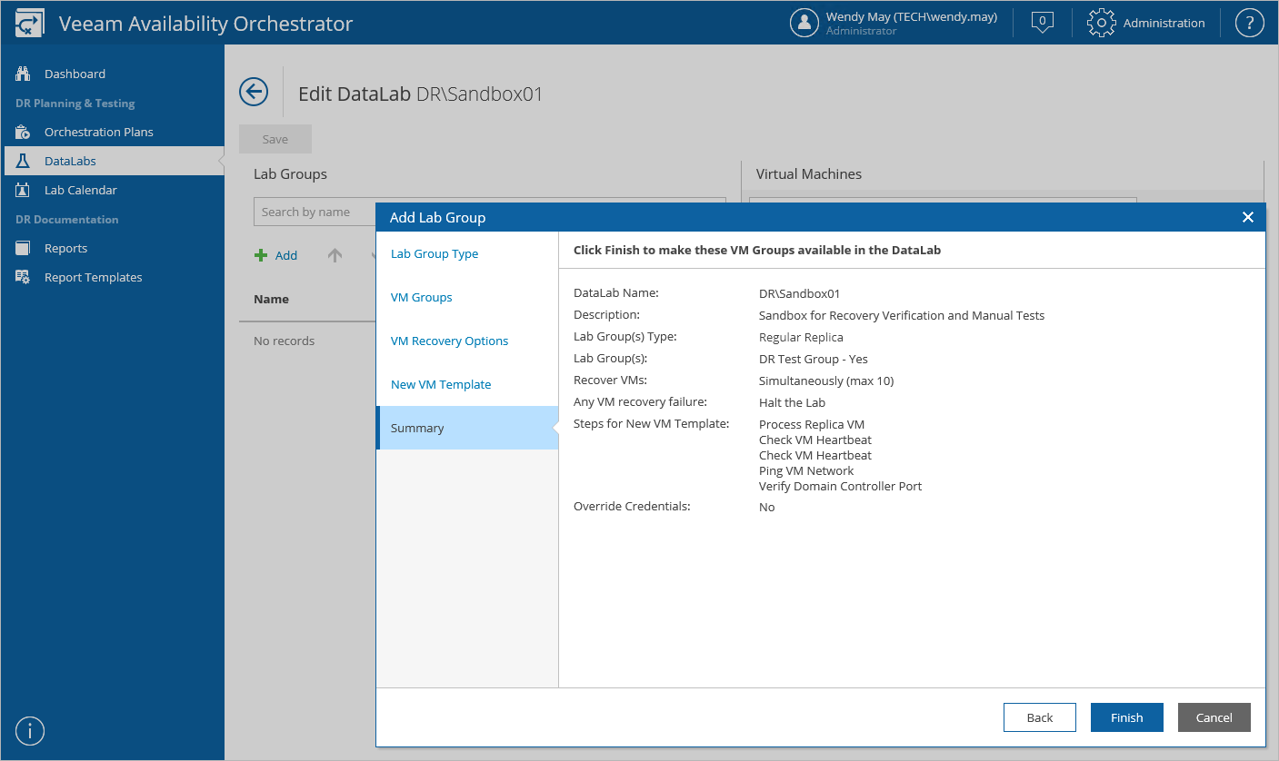 In most cases, a VM does not work in isolation but has dependencies on other services and components, such as Active Directory or DNS. To verify such a VM, the DataLab will have to supply all services on which this VM is dependent. For this purpose, VAO uses lab groups.