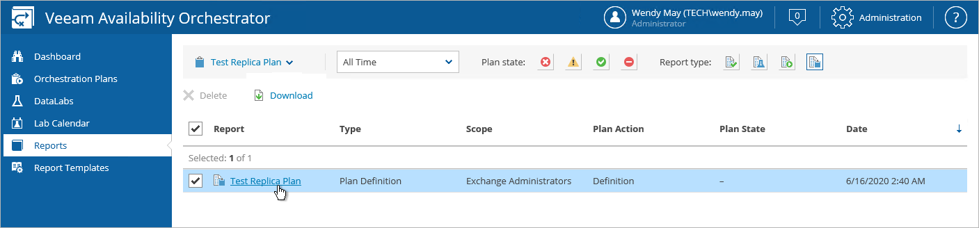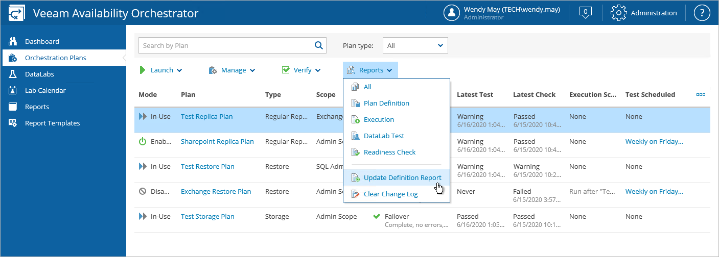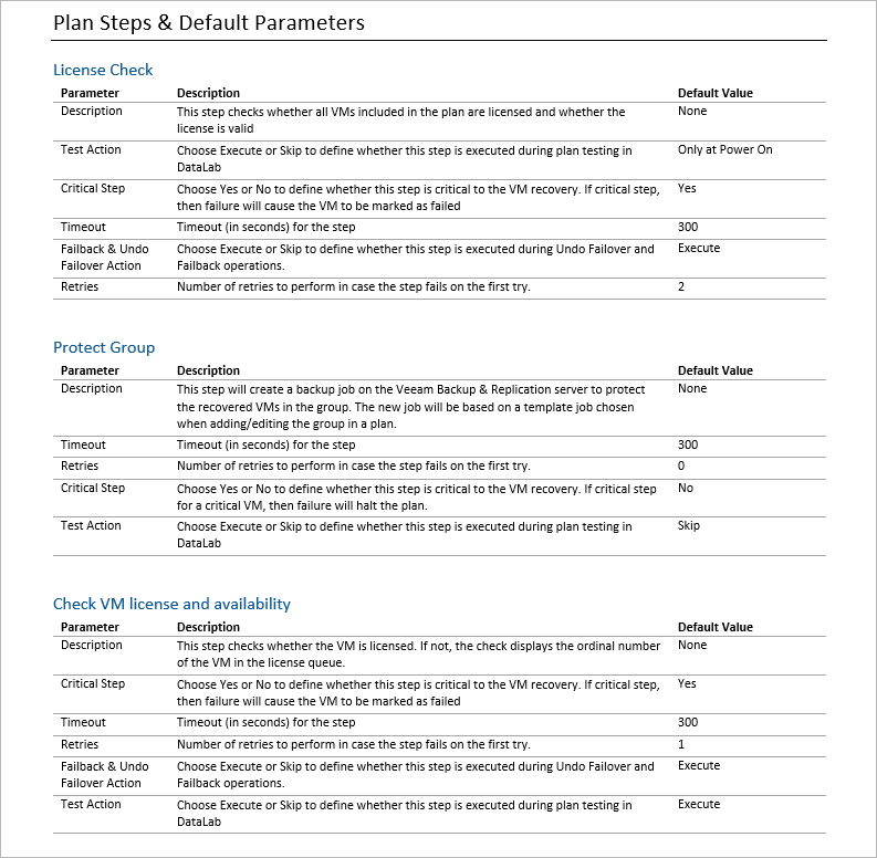 As soon as you create an orchestration plan, you will be able to generate the Plan Definition Report. The report provides an easily shareable view of the following plan details: it will show all VM groups, plan steps and parameters defined by the plan. This document is ideal for auditors and managers, and can be used to obtain a sign-off from application owners who need to verify plan configuration.